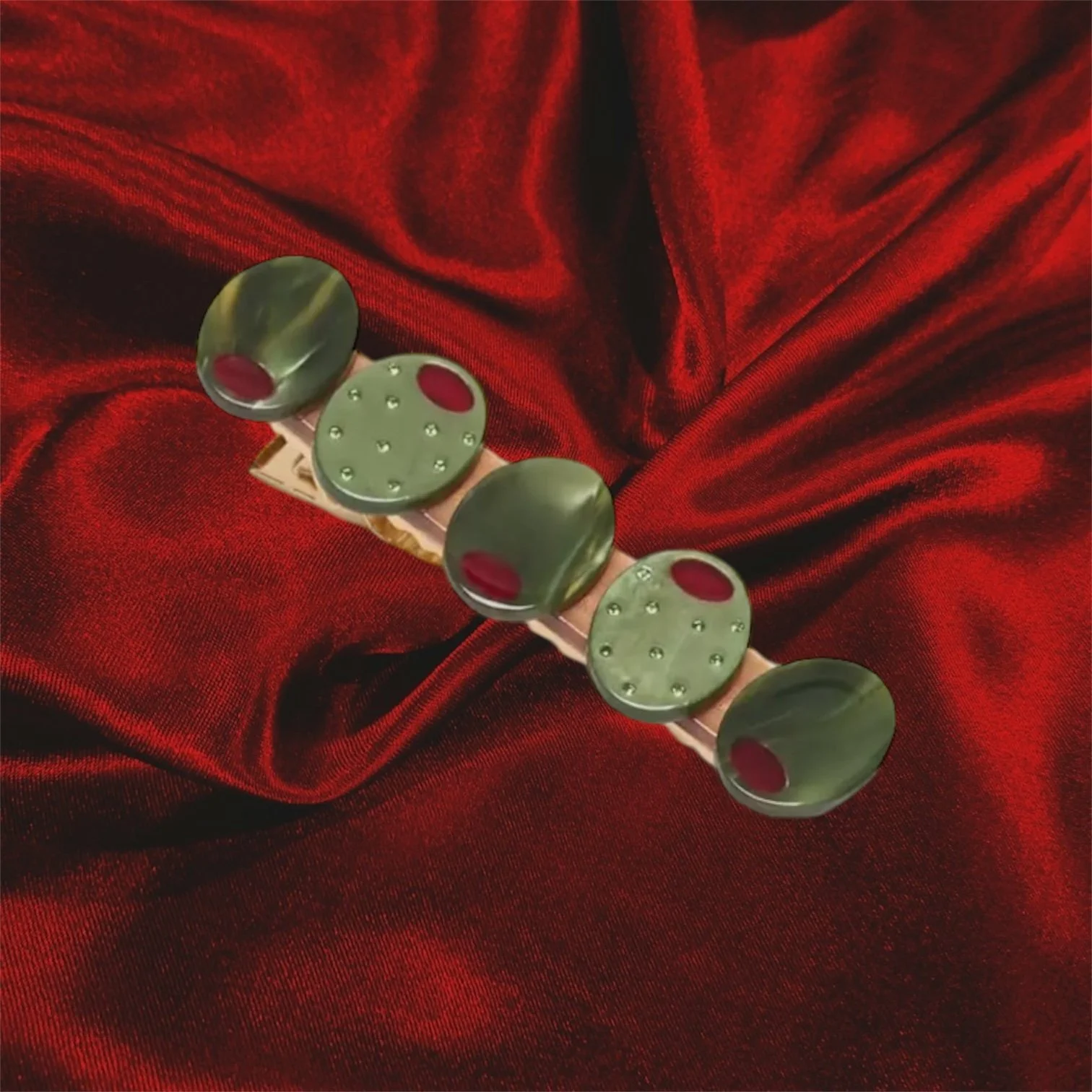 Introducing the ultimate bacon-inspired hair clips to keep your locks in check! Handcrafted from cellulose acetate, this set of two bacon alligator clips offers a sustainable twist to your style routine. Ideal for breakfast enthusiasts and trendsetting fashionistas seeking a playful yet eco-friendly accessory! Each clip measures 2.5" x 0.75"